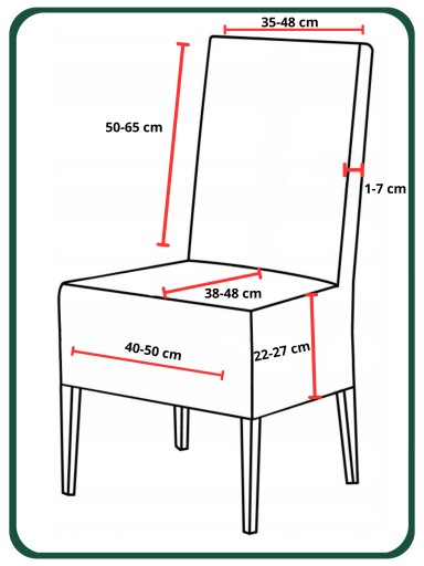 Na grafice obok znajdują się wymiary krzeseł na jakie pasuje nasz pokrowiec. Jeśli masz +- 2 cm większe/mniejsze krzesło - nasz pokrowiec nadal będzie pasował!