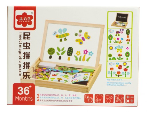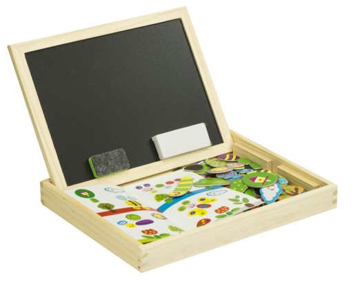 Drewniana tablica dwustronna z magnetycznymi puzzlami do układania obrazków.