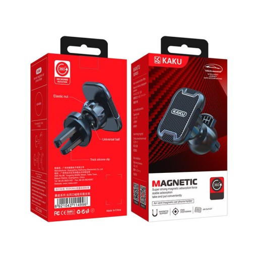Uniwersalny uchwyt samochodowy do smartfonów, renomowanej marki Kaku. Dzięki dopasowaniu do szerokości większości telefonów, zapewnia im bezpieczeństwo i stabilność podczas podróży. Uchwyt montowany do kratki wentylacyjnej z bardzo silnym magnesem, zamontowanym na froncie pozwala łatwo i bez zbędnej ingerencji zamontować telefon. Koniec z niewygodnymi uchwytami rozsuwanymi przy pomocy obydwu dłoni. Wystarczy zbliżyć telefon z doklejoną blaszką magnetyczną, aby zamontować urządzenie do uchwytu.