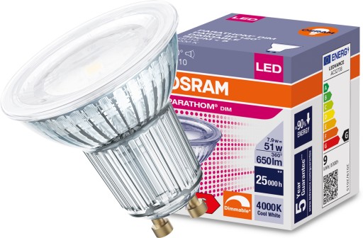 Żarówka LED renomowanej i uznanej w branży oświetleniowej firmy OSRAM z serii PARATHOM z trzonkiem GU10, kącie padania światła 120° i mocy wynoszącej 7,9W (odpowiednik klasycznego halogenu o mocy 51W) to wysokiej jakości źródło światła o neutralnej barwie 4000K i strumieniu świetlnym 650lm.