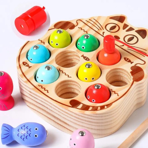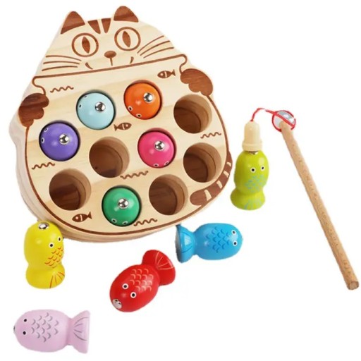 Zestaw zawiera kolorowe rybki z magnesami które unosimy z pomocą wędki a następnie umieszczamy w otworach podstawy kotka. Dziecko może dowolnie przenosić i sortować rybki. Taka zabawa szybko się nie znudzi! :)