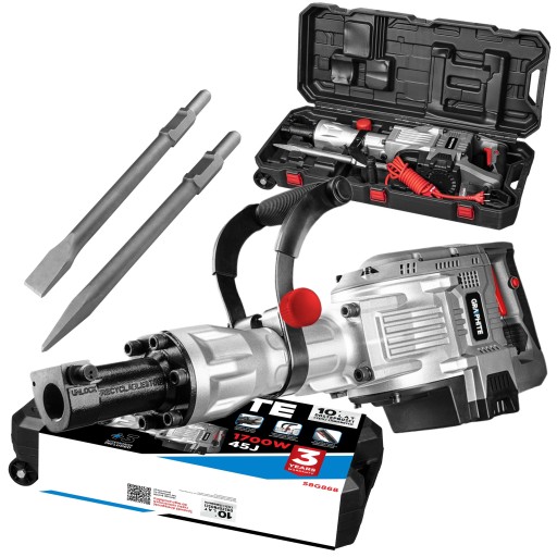Młot kujący od marki GRAPHITE cechuje się energią udaru 45 J oraz częstotliwością 1500 uderzeń dłuta na minutę. Jego obudowę przekładni wykonano z odpornego na uszkodzenia mechaniczne oraz wysokie temperatury stopu aluminium. Ułatwieniem w użytkowaniu młota jest również włącznik czteropalcowy oraz funkcja blokady do pracy ciągłej.