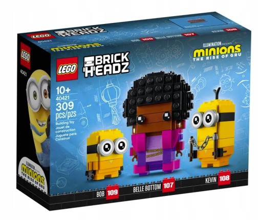 W zestawie LEGO® BrickHeadz™ Belle Bottom, Kevin i Bob (40421) znajdziesz trzy postacie z filmu o Minionkach: Belle Bottom, Minionka Kevina i Minionka Boba z bronią. Jak zawsze w przypadku modeli z kolekcji LEGO BrickHeadz, każda z trzech figurek ma tabliczkę z informacjami o postaci i solidną płytkę, która pozwala ją wyeksponować — osobno, w grupie lub razem z innymi modelami BrickHeadz.