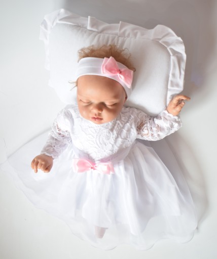 PIĘKNY BAWEŁNIANY KOMPLET DO CHRZTU SUKIENKA I OPASKA KORONKOWA