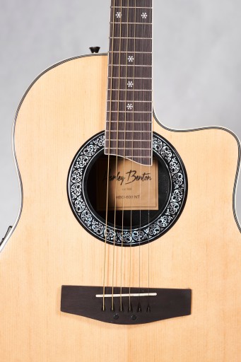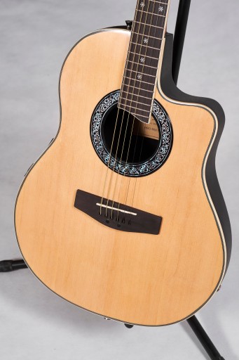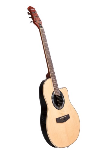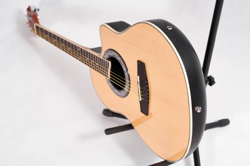 - Kształt: ovation (zaokrąglony spód) z cutaway