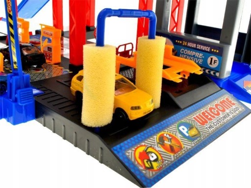 Parking wielopoziomowy dla samochodów to fantastyczna zabawa dla każdego młodego chłopca. Nachylenie, ruchoma platforma, wskaźniki drogowe, stacja paliwowa oraz myjnia samochodowa stanowią doskonałe dodatki do zestawu.