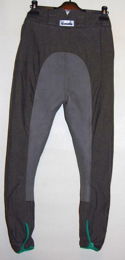 przedmiotem sprzedaży są bryczesy marki CAVALLO. Wykonane z bawełny z elastanem; są dość grube; umiarkowanie elastyczne; na materiale widnieje subtelny skośny prążek. Niespotykany, subtelny kolor zieleni w odcieniu szałwii. Wysoki stan, dwie kieszenie; leje pełne zamszowe; na dole nogawek mocne rzepy i lamówka; zapięcie na zamek oraz haftkę. Jest to świetny jakościowo produkt; bryczesy są świetnie zachowane; bez uszkodzeń; nie są bardzo sprane; ich jedyny mankament to ślady po chyba jakimś smarze; są widoczne na zdjęciach; przy odrobinie wysiłku powinny być możliwe do usunięcia. Ogólnie bryczesy wyglądają na użytkowane z umiarem. Polecam i zapraszam do udziału w aukcji!