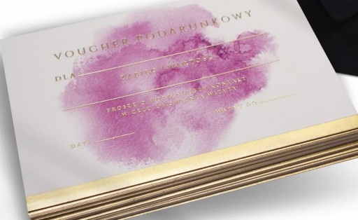 Voucher uszlachetniony folią złotą wykonany metodą hotstampnigu. Tekst oraz dolny pasek jest złocony i jednocześnie tłoczony.