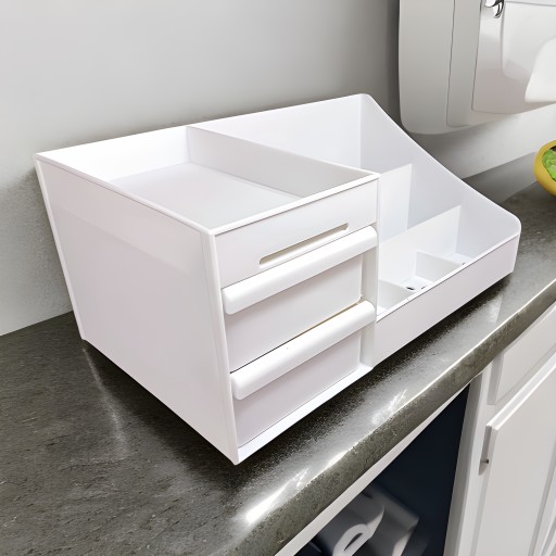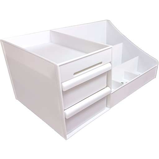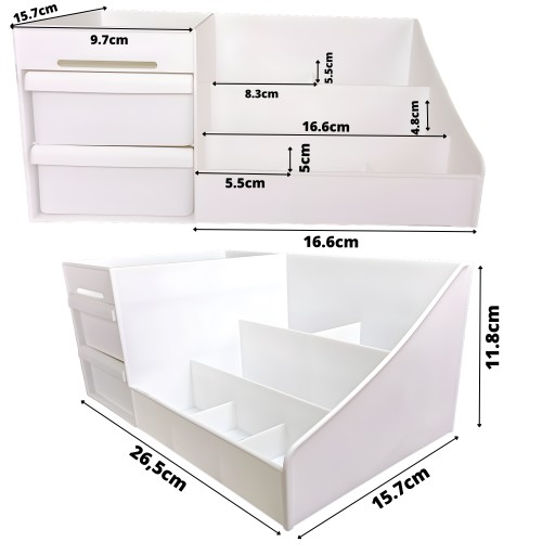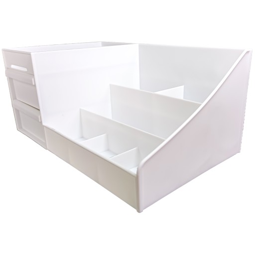 Posiadający 2 szufladki oraz 7 przegródek, organizer umożliwia posegregowanie kosmetyków, co pozwoli na szybkie znalezienie potrzebnych kosmetyków. Zapewnia optymalne wykorzystanie przestrzeni i utrzymanie porządku.