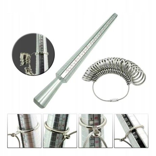 Pomiarowe narzędzie jubilerskie - zestaw 2 - elementowy czyli trzpień do pomiaru pierścionków oraz obręcze do pomiaru palców.