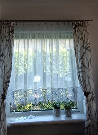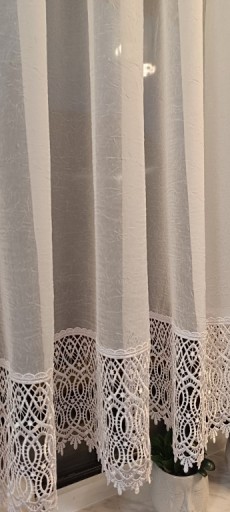 Gipiura w połączeniu z gładką tkaniną tworzy elegancką i efektowną firankę, która ozdobi każde wnętrze i idealnie nadaje się do salonu, kuchni lub sypialni.