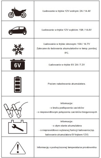W zależności od wyboru funkcji wyświetlacz LCD wskazuje stan pracy prostownika: