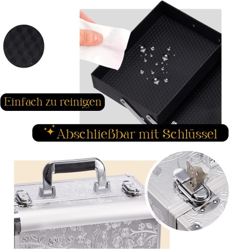 - Stylowy wygląd: kosmetyczka ma srebrną powierzchnię, na której wytłoczona jest srebrna róża. Srebrna aluminiowa rama z wytłoczeniem róży zapewnia stylowy i elegancki wygląd.