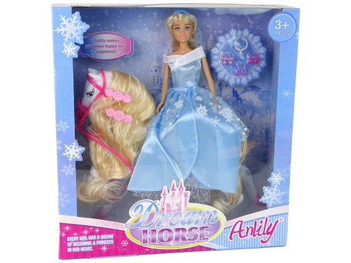 Śliczna lalka Anlily w tej odsłonie jako przepiękna lodowa księżniczka. Lalka ma na sobie balową suknię w niebieskiej kolorystyce z motywem śnieżynek a także stylowe dodatki: kolczyki i kolię. Długie blond włosy są idealne do czesania załączona szczotką. W zestawie znajduje się koń dla lalki, który również ma piękną, bujną grzywę i ogon, idealne do stylizowania. Na grzywie ma założone dwie kolorowe spinki. Gumowe, różowe siodło i uprząż sprawiają, że można go przygotować do wspaniałej podróży. Dziewczynki z pewnością będą zachwycone tym zestawem, który zabierze je w magiczną podróż do krainy marzeń! Lalka nie stoi samodzielnie. Kolory dodatków mogą się różnić od przedstawionych na zdjęciach.