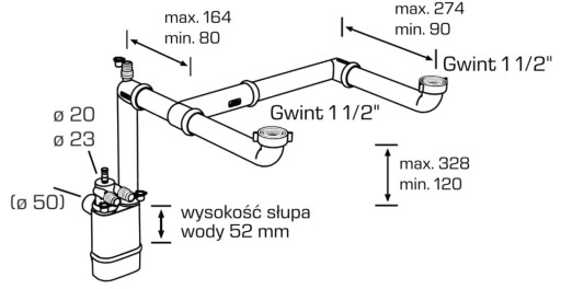 Oszczędzający miejsce półsyfon zlewozmywakowy dwukomorowy bez spustów z trzema przyłączami AGD oraz z przyłączem skroplin z kondensatu.