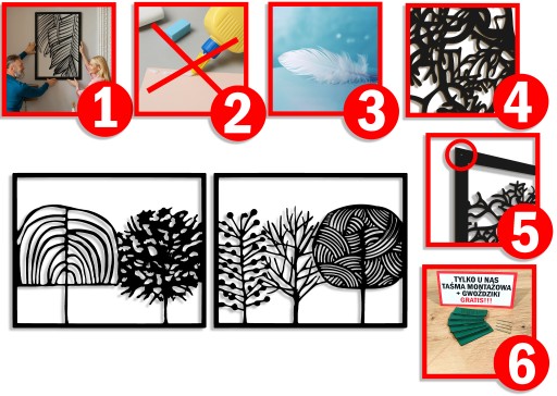 - W komplecie zestaw taśm montażowych samoprzylepnych i gwoździków ( 2 sposoby montażu do wyboru !!! ) dzięki którym super łatwo powiesisz obraz