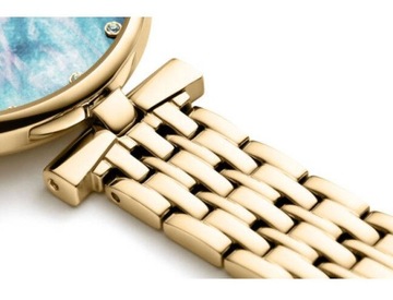 Kolor biały, z masy perłowej, wysadzana cyrkoniami, wskazówki i indeksy w kolorze koperty
