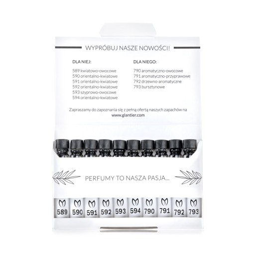 W zestawie znajduje się 10 próbek perfum najnowszych zapachów Glantier, wprowadzonych w 2023 roku.