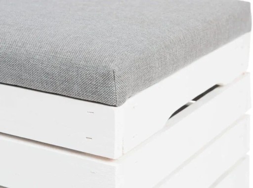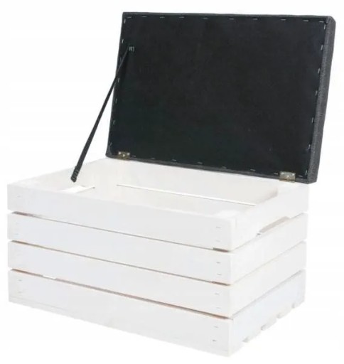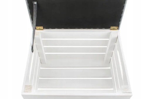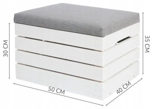 SPECYFIKACJA- materiał: drewno świerkowe + pianka; kolor obicia: szary; kolor listewek: biały; maksymalne obciążenie: 150kg; wymiary skrzyni (dł/szer/wys): 40/50/35cm; waga skrzyni: 6,3kg; waga z opakowaniem: 7kg.