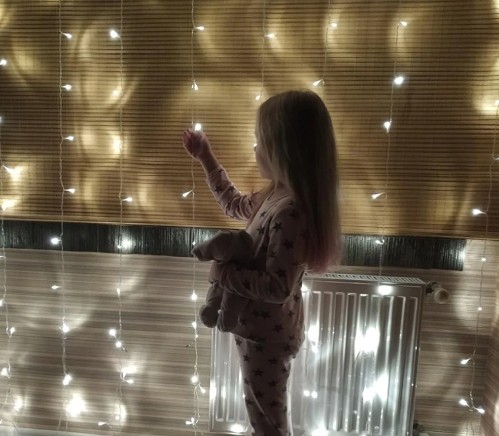 Lampki - kurtyna świetlna LED w barwie światła zimna biel rozmiarze świetlnym 2 m szerokość x 3 m. wysokość, dodatkowa wtyczka co pozwala łączyć kilka kurtyn ze sobą.