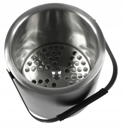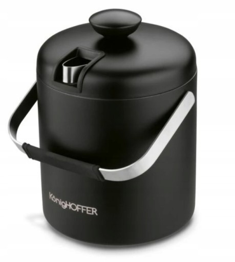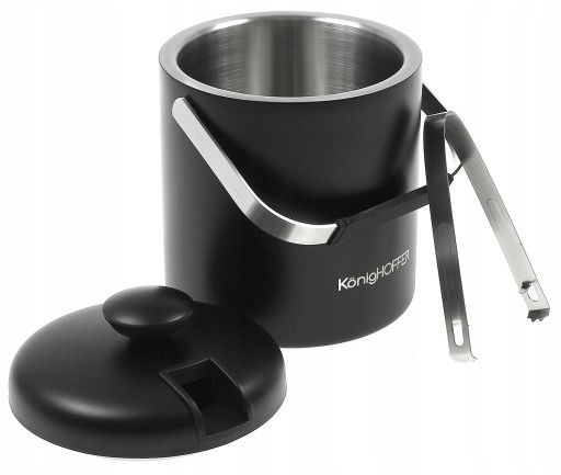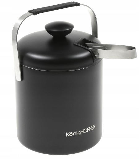 Świetny pojemnik na lód w kolorze czarnym wykonany ze stali nierdzewnej wysokiej jakości. W skład wchodzą: pojemnik z uchwytem, pokrywka oraz poręczne szczypce. Pojemnik idealny na prezent.