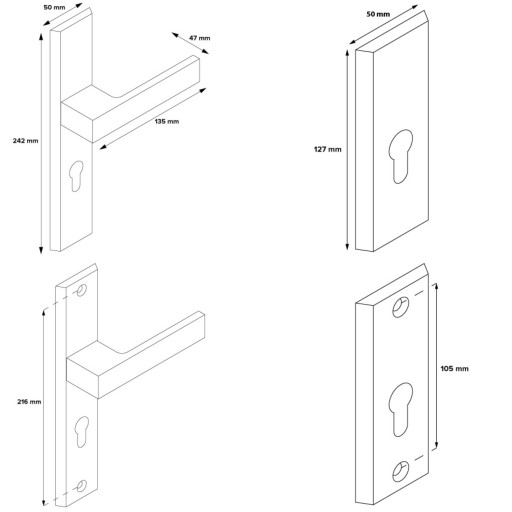 ✅ Otwory montażowe, zarówno klamki jak i szyldu górnego rozmieszczone są uniwersalnie tak, aby umożliwić montaż zestawu z większością zamków stosowanych do drzwi zewnętrznych na polskim rynku