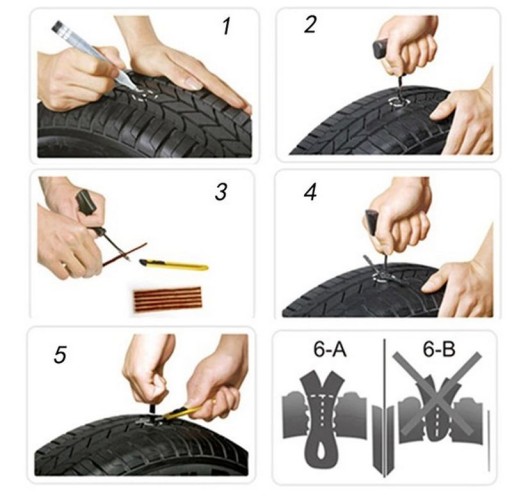 - na szydło nawlecz sznur butylowy, następnie szybkim ruchem wepchnij szydło w miejsce przebicia opony, czynność powtórz (sznur powinien wystawać ok 1 cm nad bieżnik opony)