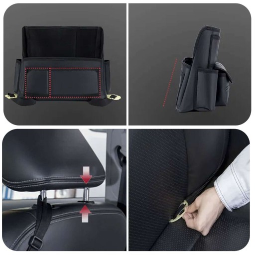 ✅ Organizer posiada dwa paski, które należy przymocować na zagłówku kierowcy oraz pasażera. Dodatkowo dwa elastyczne paski, zakończone plastikową klamerką, znajdujące się w tylnej części organizera należy przeciągnąć pomiędzy przednimi fotelami, a podłokietnikiem i wsunąć w szczelinę siedziska.