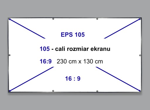 Ekran produkowany jest w Polsce z wysokiej jakości tkaniny poliestrowej, zapewniającej duży kontrast, jasność i kąt widzenia. Oferujemy sześć rozmiarów tego typu ekranu; 125 cali, 105 cali, 102 cale, 75 cali, 72 cale i 62 cale. Na tej aukcji ekran ma przekątną 105" (wyświetlany rozmiar obrazu 230 cm x 130 cm).