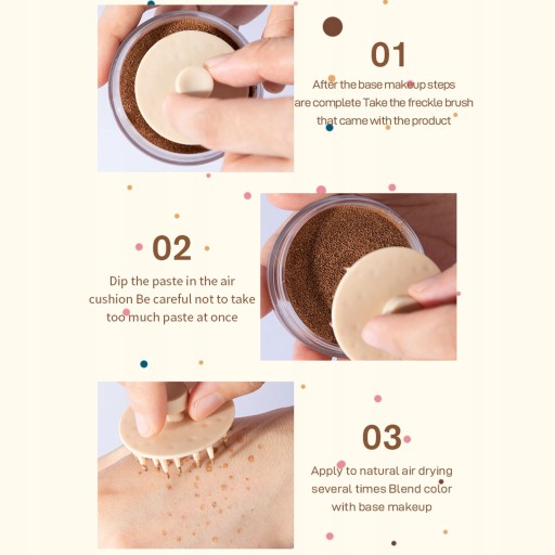 5. Trwały efekt: poduszka piegów szybko schnie, zapewnia trwały efekt makijażu, z silną wodoodpornością i odpornością na rozmazywanie.
