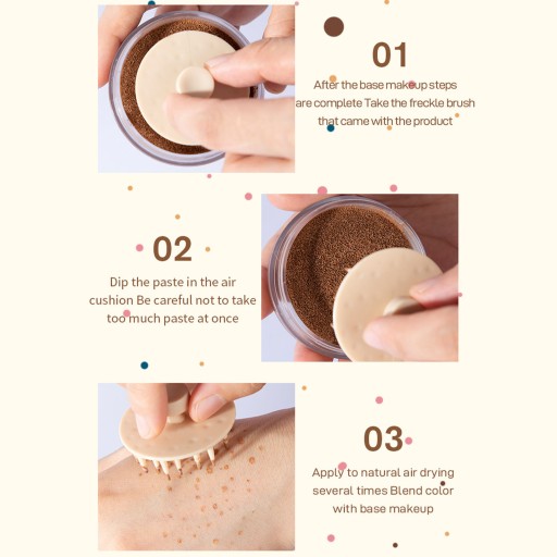 5. Trwały efekt: poduszka piegów szybko schnie, zapewnia trwały efekt makijażu, z silną wodoodpornością i odpornością na rozmazywanie.