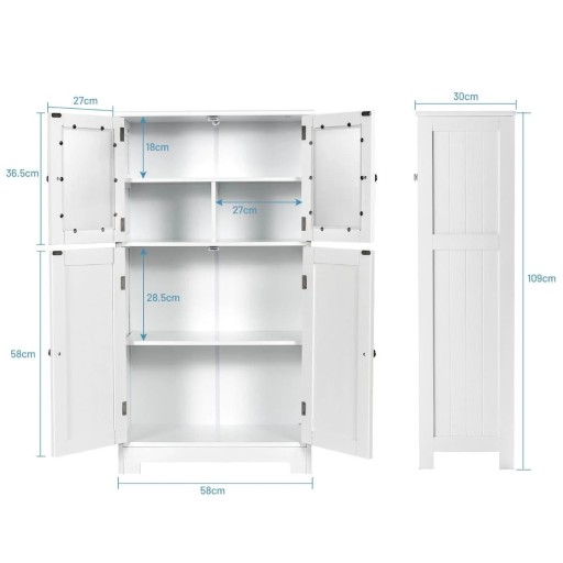 Uporządkowana przestrzeń: Nasza szafka została wyposażona w 4 poziomy, które zapewniają mnóstwo miejsca do przechowywania różnych rzeczy, takich jak przybory toaletowe, koce, ręczniki, książki, słoiki z przyprawami, wszelkiego rodzaju akcesoria lub wiele innych. Dodatkowo niższa półka wewnętrzna podlega regulacji w 3 pozycjach, które można dostosowywać w zależności od zapotrzebowania.