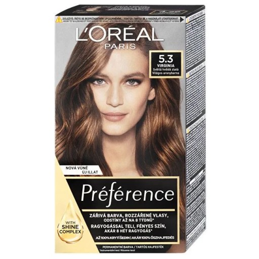 Luksusowa farba do włosów L’Oréal Paris Préférence nada Twoim włosom olśniewający połysk. Możesz cieszyć się lśniącymi, lśniącymi włosami nawet przez osiem tygodni. Formuła jest wzbogacona o Hi-Shine Complex i zawiera wysoce odporne składniki barwiące. Opakowanie zawiera również końcową pielęgnację, która jest wzbogacona filtrem UV i witaminą E. Dzięki temu Twoje włosy pozostaną lśniące i jedwabiście miękkie. Dzięki ultra intensywnemu, długotrwałemu kolorowi Préférence zapewnisz sobie luksus, na jaki zasługują Twoje włosy. Nadaje włosom olśniewający połysk wysoka odporność koloru przez 8 tygodni długotrwały i ultra-intensywny kolor jedwabiście miękkie włosy Hi-Shine Complex – nadaje włosom olśniewający połysk filtr UV i witamina E – dla błyszczących i jedwabiście miękkich włosów o wysokiej odporności składniki koloryzujące 5.3 Virginia Jasny brąz złoty
