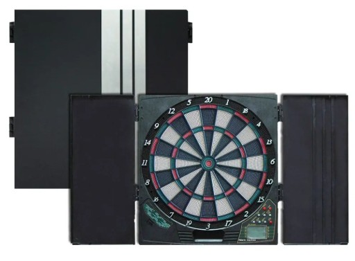 Szczegóły wykonania:- tarcza elektroniczna o średnicy 34,5cm;- wymiary 41x45x4cm;- zasilana zasilaczem 230V - w zestawie;- duży wyświetlacz LCD;- pamięć 8 graczy;- 29 rożnych gier – 90 wariantów;- funkcja SLEEP – oszczędność energii;- funkcja komentarza głosowego w języku angielskim;- w zestawie 6 rzutek;