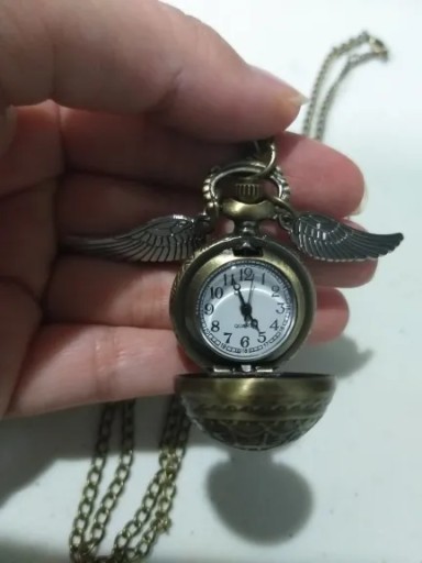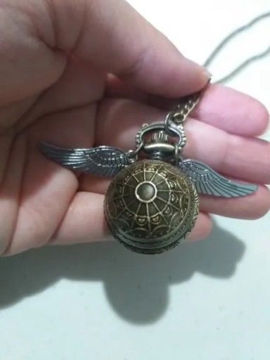 Zawieszka otwierana, w środku znajduje się w pełni funkcjonalny zegarek. Podany model jest w kształcie złotego znicza posiada dwa skrzydełka a łańcuszek jest regulowany.