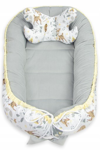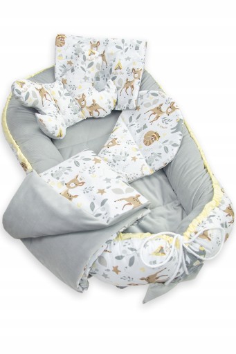 Kokon uszyty jest z bezpiecznych materiałów najwyższej jakości. Zestaw jest dwustronny. Jedna strona została wykonana z tkaniny bawełnianej 100%, druga natomiast z miłego w dotyku, ciepłego Velvetu.