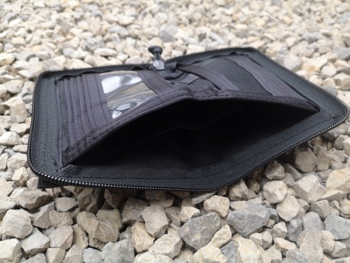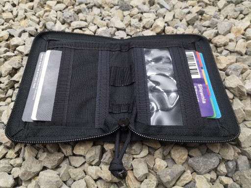 Wewnątrz głównej kieszeni znajduje się dodatkowa, wygodna przegródka do organizacji banknotów, czy dokumentów. W kieszonce tej zmieści się również dowód rejestracyjny. Cała konstrukcja portfela jest szczelnie zamykana na zamek YKK, który zabezpiecza zawartość przed wypadnięciem, a także zapewnia smukły kształt. Dzięki lince na suwaku można nim operować nawet w grubych rękawiczkach, a święcąca czaszka dodaje taktycznego charakteru z nutką lansu.