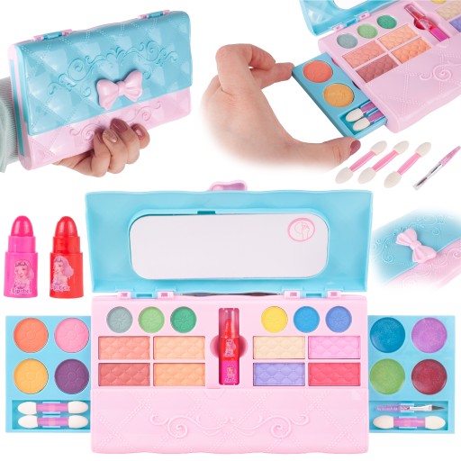 Uroczy zestaw do malowania makijażu składany w kosmetyczkę z kokardką zawiera dużą ilość różnych kosmetyków, które z pewnością ucieszą każdą małą dziewczynkę.