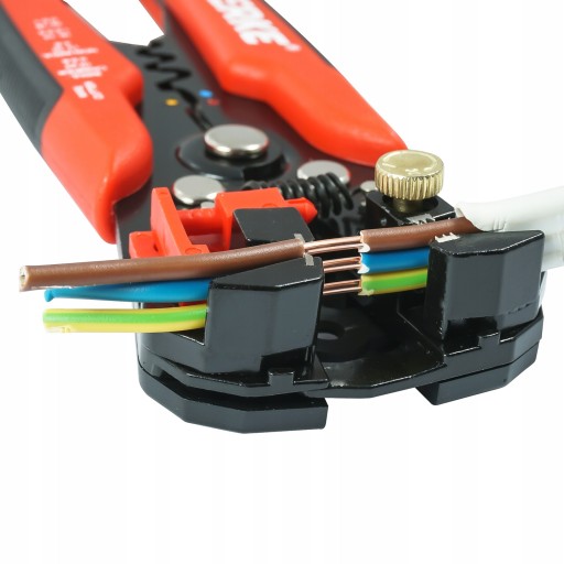 Szczypce z zestawem konektorów izolowanych. Rękojeści zabezpieczone dwukomponentowymi nakładkami z tworzywa sztucznego. Konstrukcja szczypiec umożliwia ściąganie izolacji zarówno z końcówek jak i ze środka przewodu. Ogranicznik głębokości sprawdza się podczas montażu przewodów np. w łącznikach czy w kostkach typu wago.