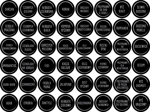 Zestaw naklejek z nazwami przypraw 192 szt. - 4 arkusze A4 na każdym 48szt. Naklejki o średnicy 35mm wydrukowane na folii samoprzylepnej, białej, matowej. Wycięte po obrysie - gotowe do naklejenia i wodoodporne. Mogą być naklejone na wszystkie powierzchnie gładkie. Nadruk jest trwały i świetnej jakości.