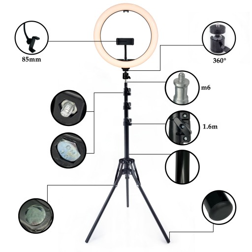 W centralnym miejscu lampy pierścieniowej umieszczony jest uchwyt na urządzenie o maksymalnej szerokości 85 mm. Posiada on elastyczną przedłużkę dzięki której można ustawić swój smartfon pod wieloma kątami. Jest to bardzo przydatne dla osób wykonujących selfie (np. prezentując wykonany makijaż), ale również do fotografowania produktów i martwej natury.