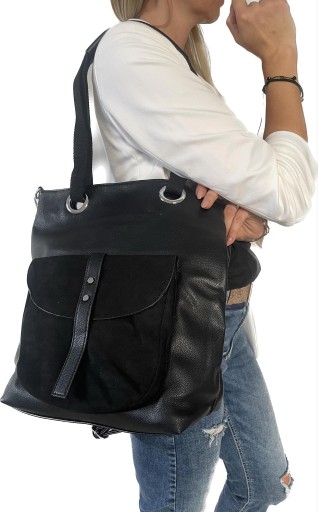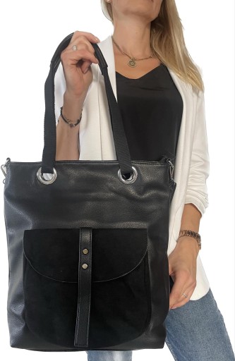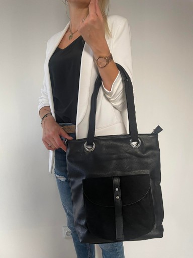 Wykonana ze skóry ekologicznej idealnie imitującej skórę naturalną oraz zamsz. Lekka, pojemna i niezwykle efektowna. Ten model idealnie sprawdzi się na co dzień. Zapięta na zamek torebka mieści format A4.