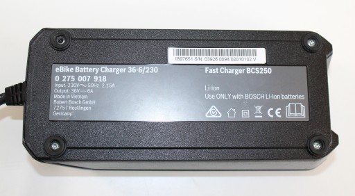 Oryginalna ładowarka do rowerów elektrycznych ze wspomaganiem firmy Bosch np. Sparta, Batavus, Gazelle, Koga Miyata, Flyer, Buls, KTM czy GIANT. ładowarka z taką wtyczką była stosowana w rowerach produkowanych od roku 2014. Ostatnie zdjęcie przedstawia gniazdo do jakiego pasuje wtyczka od ładowarki. Brak kabla zasilającego w zestawie.