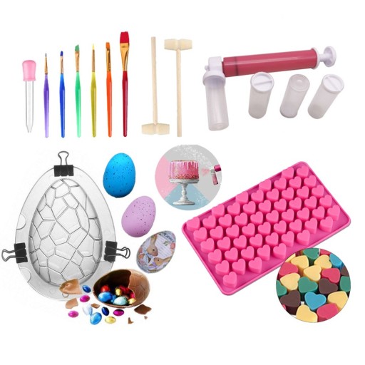 Zestaw zawiera platformową formę do tworzenia czekoladowego jajka, zestaw ręcznego aerografu, 6 pędzli, pipetę, drewniane patyczki oraz silikonową formę do czekoladowych serduszek.