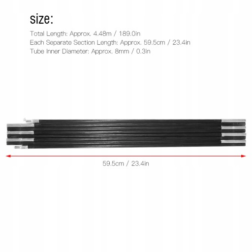 Składany słupek namiotowy z wieloma sekcjami, zawiera 2 pręty (o długości 4,48 m), każdy pręt zawiera 8 segmentów (o długości 59,5 cm każdy segment).