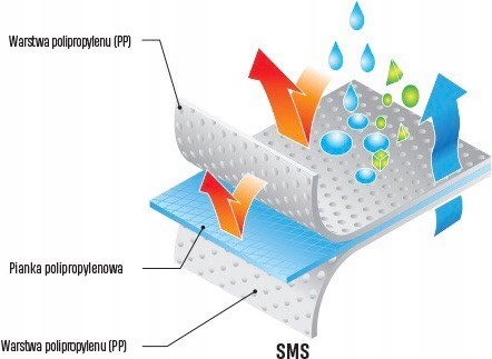 Materiał zgrzewany jest za pomocą metody ultradźwiękowej. Składają się na nią trzy warstwy włóknin: dwie zewnętrzne – Spunbond (Polipropylen) i wewnętrzna Meltblown (Pianka Polipropylenowa). Dzięki takiemu połączeniu charakteryzują się wytrzymałością, dobrą przepuszczalnością powietrza, a także wysokim poziomem filtracji bakteryjnej.