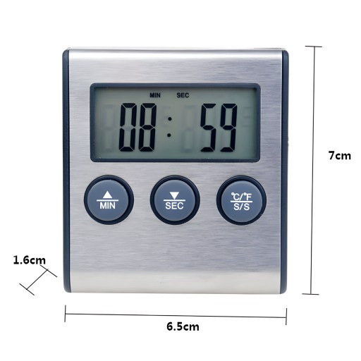 Dzięki wbudowanej funkcji alarmu timera, nie musisz już pilnować czasu, czy temperatury podczas gotowania. Po prostu ustaw żądany czas lub temperaturę, a gdy zostanie ona osiągnięta, powiadomi Cię sygnałem dźwiękowym. Minutnik z zakresem czasu aż do 99 minut i 59 sekund! Po odmierzeniu ustawionego czasu urządzenie wydaje sygnał dźwiękowy do czasu naciśnięcia dowolnego przycisku lub upłynięcia 1 minuty.