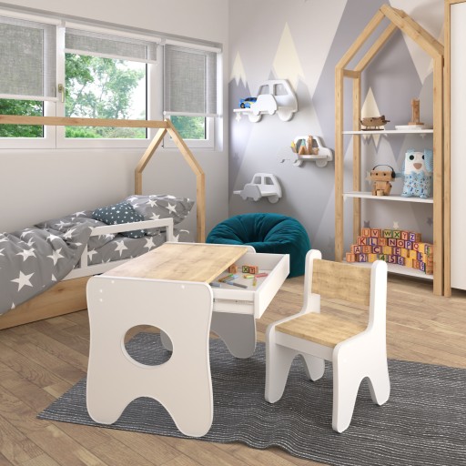 Stolik i krzesełko dla dziecka – oryginalny styl w dziecięcym wnętrzu. Meble dla dzieci zaprojektowane z myślą o bezpieczeństwie, wygodzie i prawidłowym rozwoju najmłodszych. Odpowiednio dobrane krzesełko ze stolikiem to świetny sposób na wykreowanie miejsca, które stanie się bezpieczną przestrzenią dla dzieci. Stolik i krzesełko dla dziecka to fundament zabawy, który uwolni wyobraźnię, tworząc idealne warunki do rozwoju każdego małego artysty. Mebelki wykonane są z certyfikowanych materiałów, wysokiej jakości płyty meblowej laminowanej, wszystkie narożniki są zaokrąglone by użytkowanie mebelków było bezpieczne dla naszych pociech, zaletą jest nowoczesna i bardzo stabilna konstrukcja oraz szuflada pod stolikiem gdzie dziecko może w każdej chwili coś schować albo coś wyjąć by móc bez ograniczeń kreować swoją zabawę.W zależności od potrzeb, stół sprawdzi się do nauki, malowania, zabawy czy spożywania posiłków.