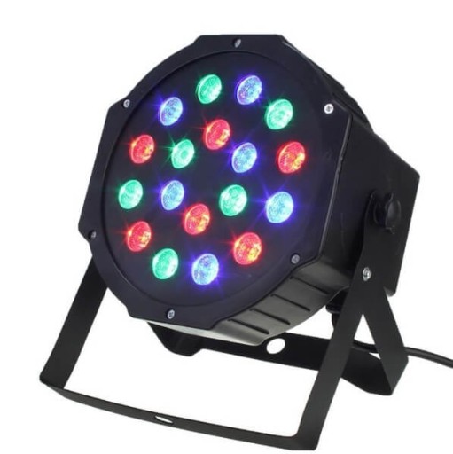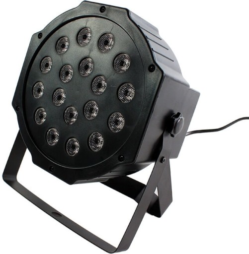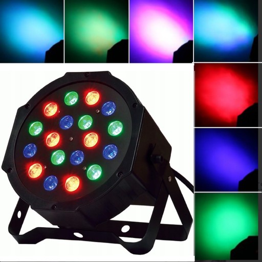 Światła dyskotekowe - kolorofon 18 diod, 3 kolory diod RGB ze stelażem. Reflektor wyposażony został w osiemnaście diod RGB o mocy 1W każda. Wszystkie z nich zapewniają mocne światło o dalekim zasięgu! Dzięki szerokiej palecie kolorów (RGB) świetnie sprawdzi się jako oświetlenie dekoracyjne dla DJ-ów, zespołów muzycznych, na prywatce, weselu, a nawet do klubu!