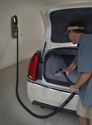 Elegancka, lekka ale równie wydajna alternatywa dla nieporęcznych odkurzaczy garażowych. Wymagane jest tylko około 2,5 metra wolnej przestrzeni na ścianie.